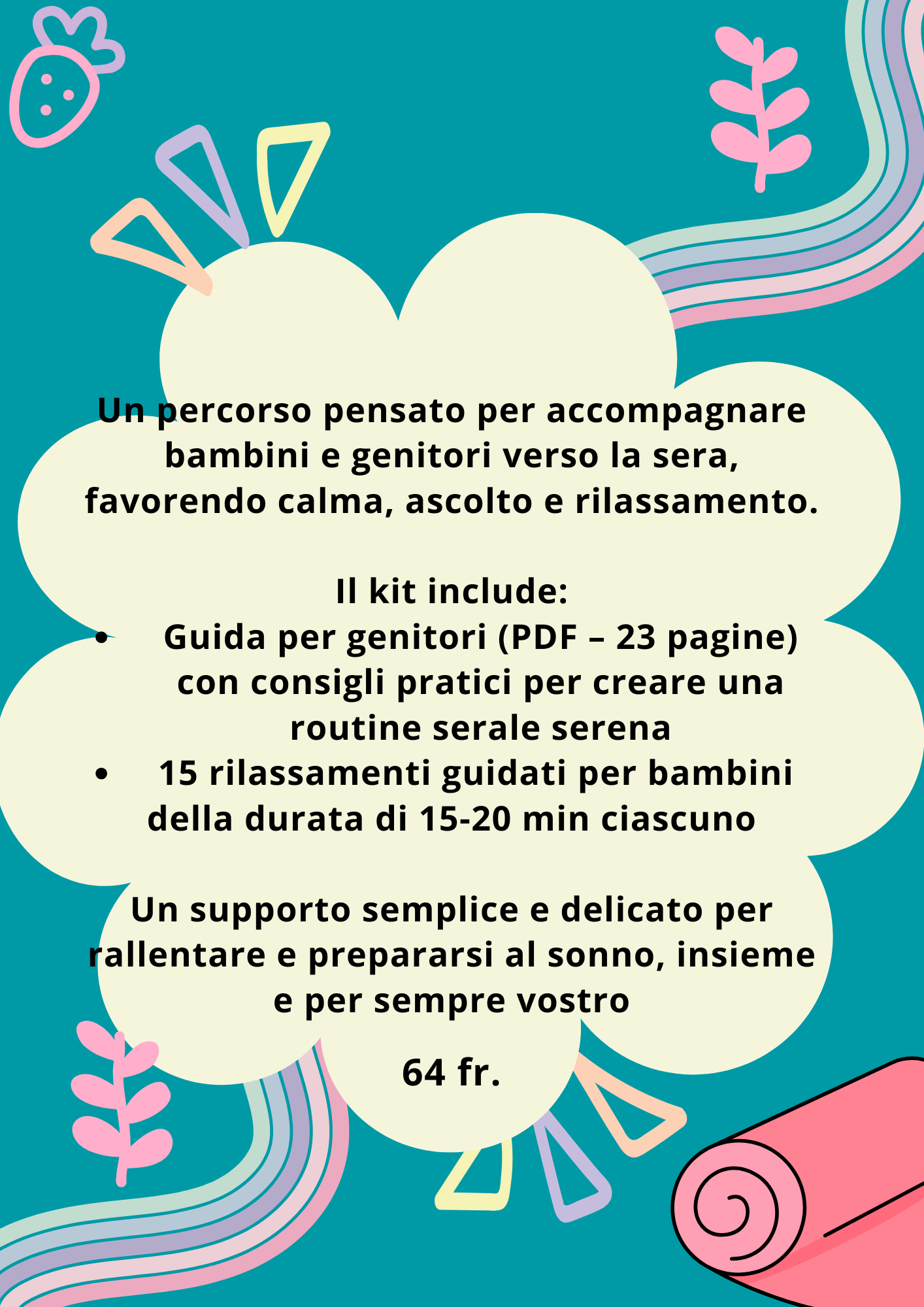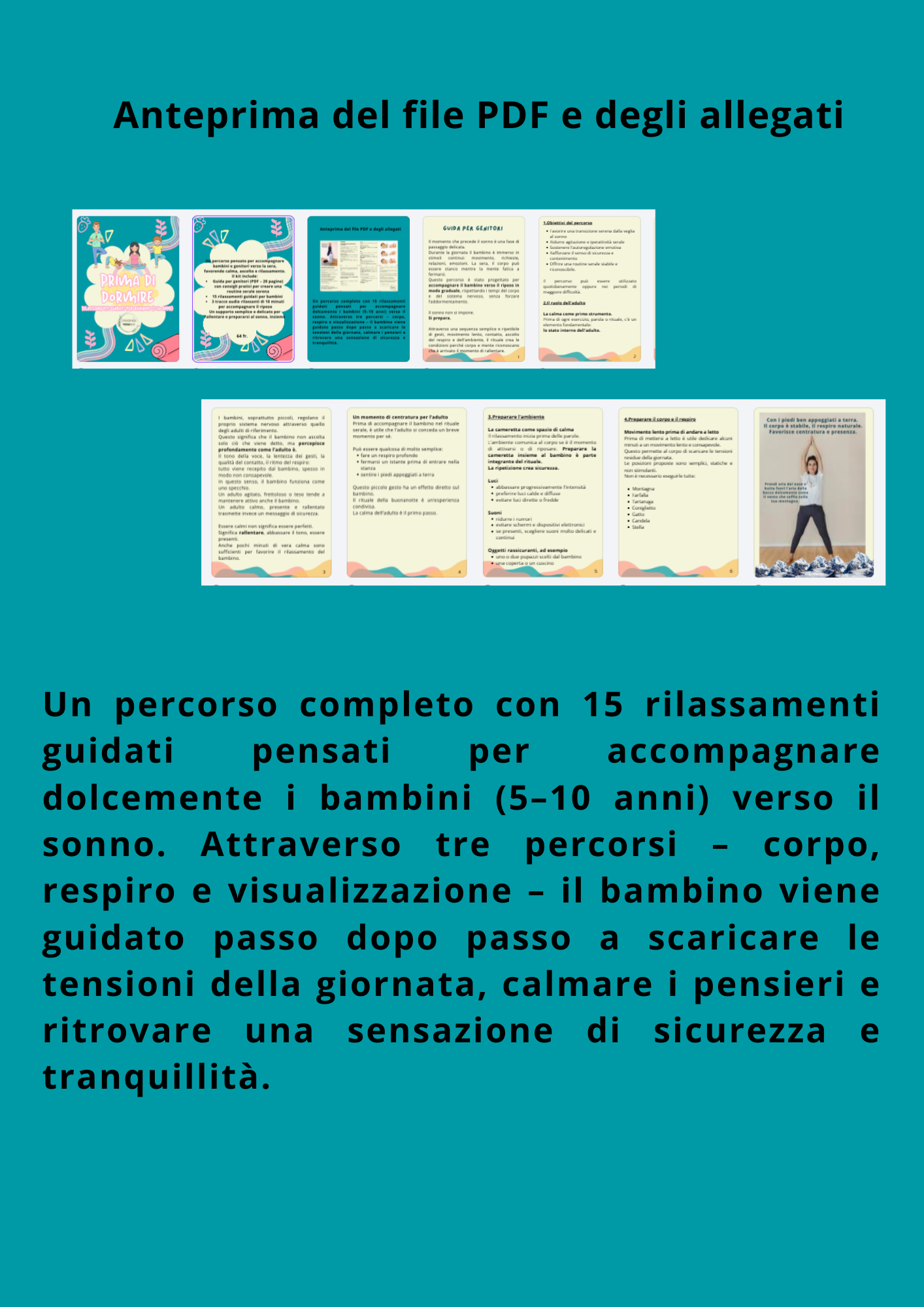 La prima parte (6–8 minuti) è guidata dalla mia voce, per accompagnare il bambino a rilassarsi attraverso il respiro, il corpo e semplici immagini.